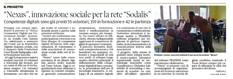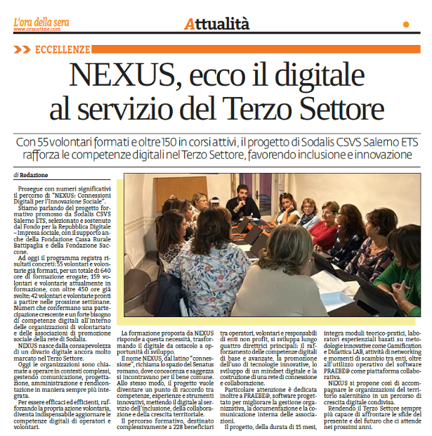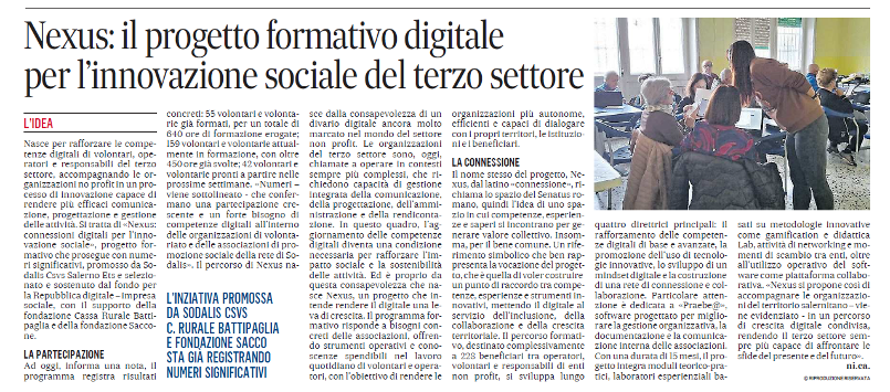 Prosegue il racconto sui media di NEXUS: Connessioni Digitali per l’Innovazione Sociale, il progetto promosso da Sodalis CSVS Salerno ETS e sostenuto dal Fondo per la Repubblica Digitale – Impresa sociale, con il supporto della Fondazione Cassa Rurale Battipaglia e della Fondazione Saccone.